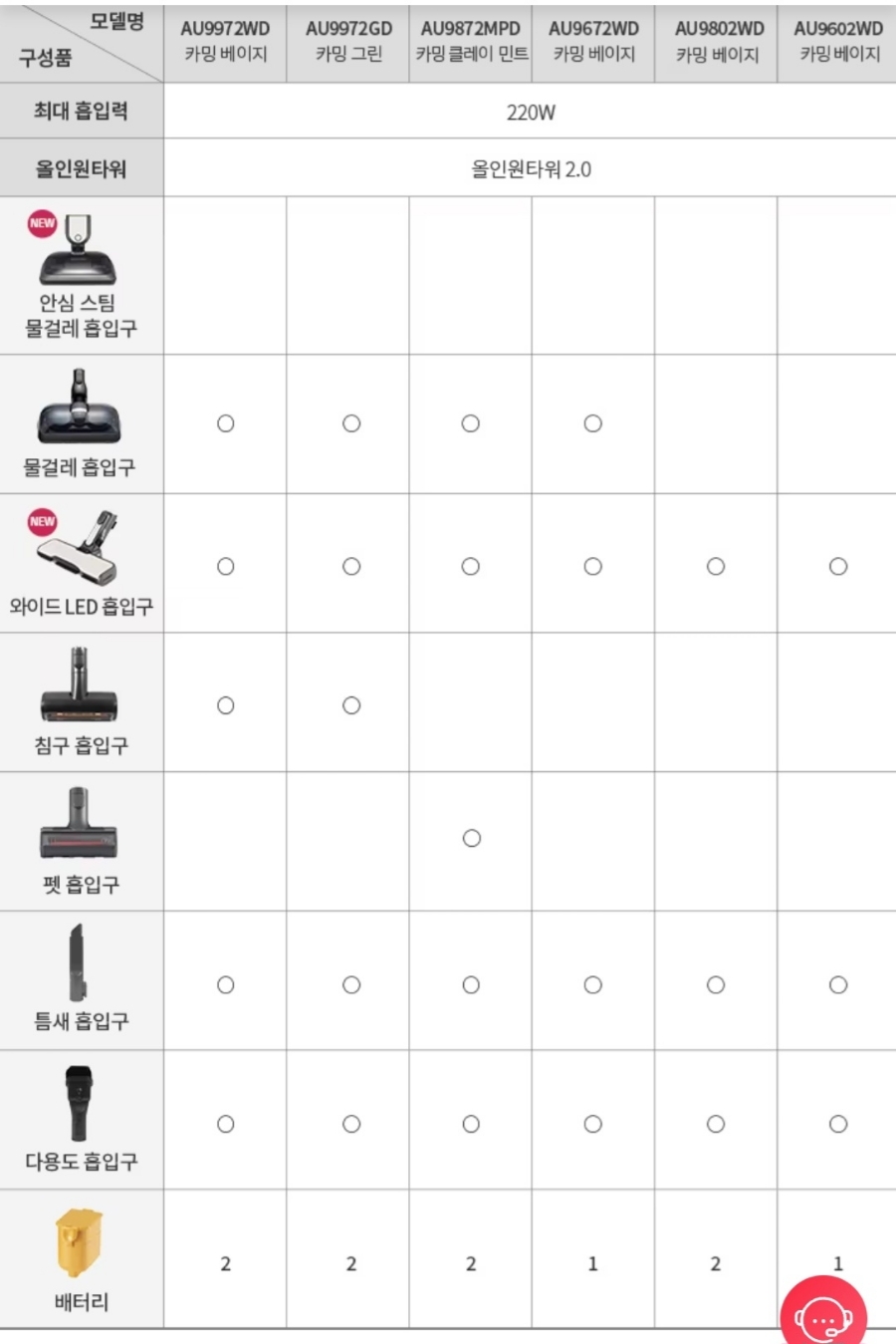 2022년 이후 제품은 두 제품 모두 220W로 흡입력은 둘 다 우수한 것 같습니다.