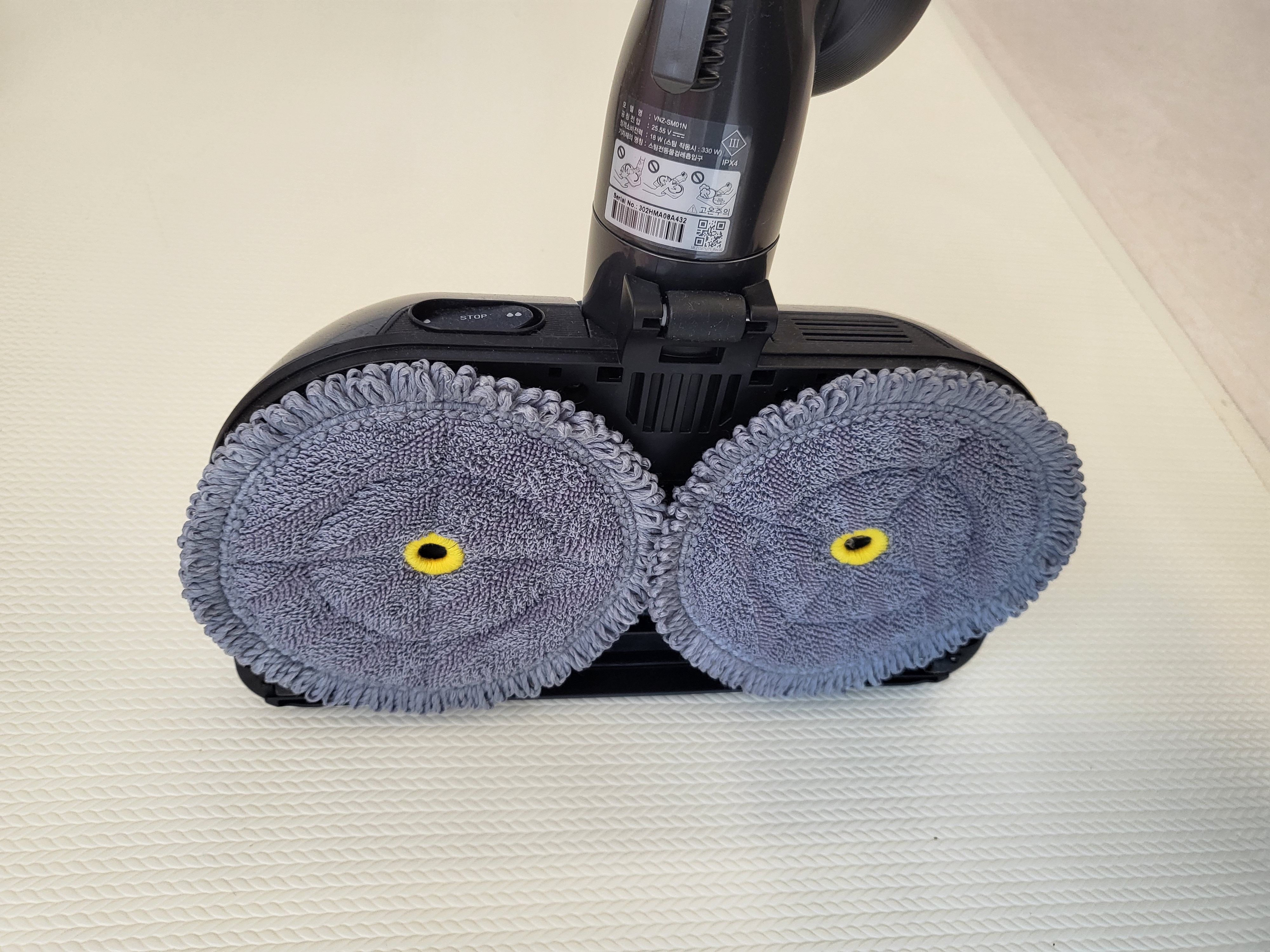 물통이 장착되고 준비가 되면 빨아두었던 물걸레포를 부착하고 물걸레 헤드를 본체에 결합 시켜줍니다.